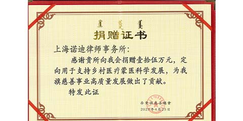 On April 25, 2025, the Naiman Banner Charity Federation issued the Donation Certificate to Shanghai Nuo Di Law Firm in recognition of its outstanding contribution to the high-quality development of charity.