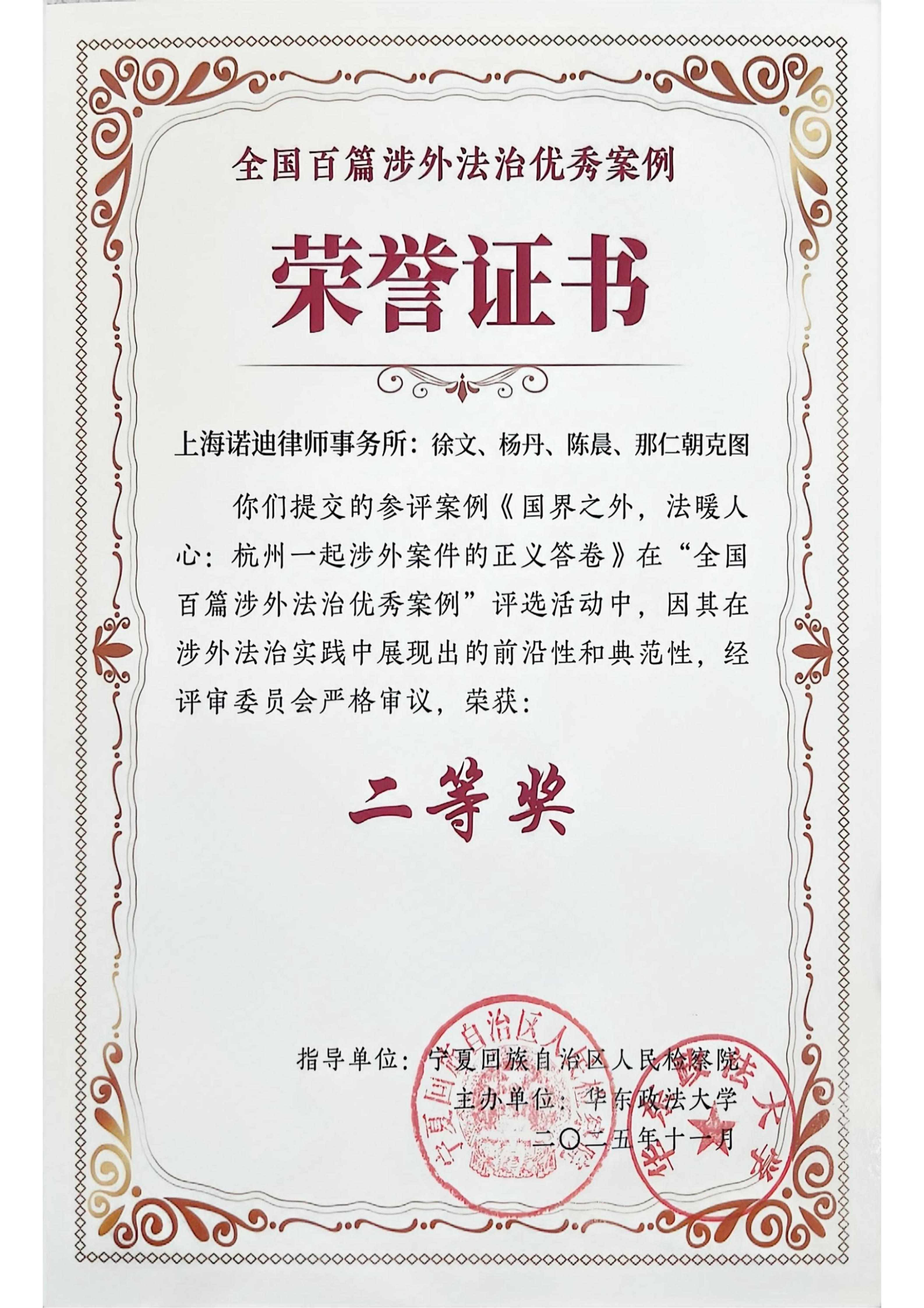 Recently, the criminal case of affray involving foreign students, represented by Lawyers Xu Wen, Yang Dan, Naren, and trainee lawyer Chen Chen from Shanghai Nuo Di Law Firm, was successfully selected into the first National Top 100 Excellent Foreign-Related Legal Cases hosted by East China University of Political Science and Law in 2025. The proper handling of this case not only demonstrated the impartiality and authority of China's judiciary, but also showcased the professional defense capabilities and humanistic care of lawyers in foreign-related cases.